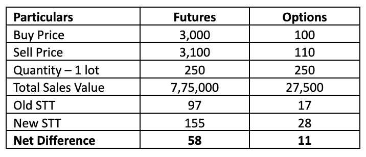 - The STT for selling 1 lot of Nifty Futures has risen from approximately Rs 77 to Rs 123, an increase of Rs 46.