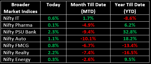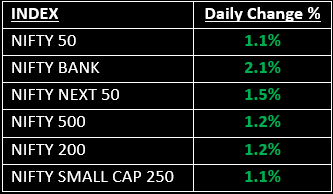 Market breadth remained strong, reflecting broad-based participation across segments. The Nifty Midcap and Smallcap indices advanced in the range of 1.3% to 1.5%.