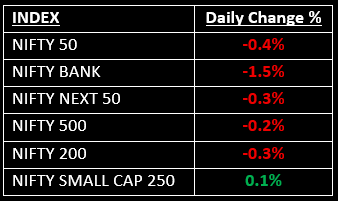 The Indian markets ended Tuesday on a bearish note, with the Nifty 50 closing below the psychological support level of 24,000, pressured by a sharp sell-off in the banking sector. Read our technical analysis on Nifty, Bank Nifty, support/resistance levels and top performing stocks.