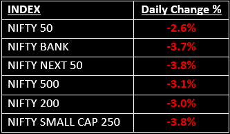 All sectoral indices closed in the red, indicating a broad-based sell-off across the market.