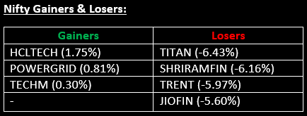 - HDFC Bank: Stock extended its losing streak, falling over 4.5%, following the termination of three senior executives over lapses at the bank's Dubai branch. Read our full HDFC Bank Analysis here.