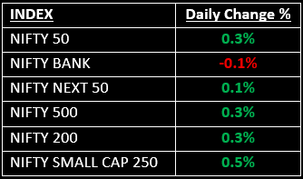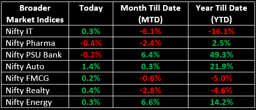Broader markets outperformed the benchmarks, as the Nifty Midcap index advanced 0.5% and the Smallcap index gained 0.4%.