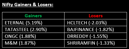 Sectoral performance remained largely positive, with all indices closing in the green except Pharma and PSU Bank. The Media index led the rally with a 2.4% rise, followed by the Auto index, which climbed 1.4%.