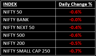 Broader indices mirrored the benchmarks, with the Nifty Midcap and Nifty Smallcap indices both slipping over 0.5%. Among sectors, only Defence, Consumer Durables, Financial Services and Metals saw gains, while the rest ended in the red.