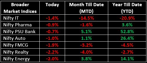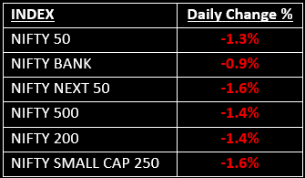 Broader markets also faced significant pressure, with the Nifty Midcap and Smallcap indices falling nearly 1.8% each. On the sectoral front, all major indices closed in the red. Energy, Metal and Realty led the decline with losses of 2-3% each.