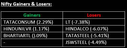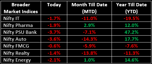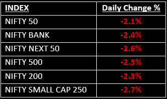 The broader indices lagged the benchmarks, with both the Nifty Midcap and Smallcap indices dropping around 2.5%. All sectors closed in the red.