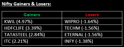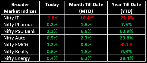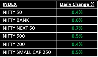 The broader indices remained relatively stable and outperformed the main indices, with the Nifty Midcap and Nifty Smallcap indices each rising 0.5%. On the sectoral front, all indices closed higher, except for IT, which saw a decline of 1.2%.