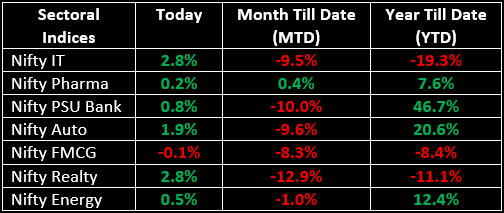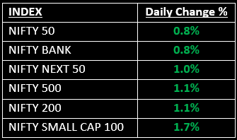 Broader markets outperformed the key benchmarks, with the Nifty Midcap 100 gaining 2% and the Nifty Smallcap 100 rising 1.7%. On the sectoral front, all indices ended in the green, barring FMCG and Metal.