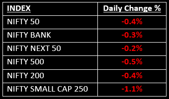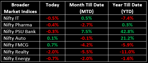 Among the broader indices, the BSE Midcap index mirrored the benchmark’s decline, falling 0.4%, while the Smallcap index underperformed, falling 1.3%. On the sectoral front, apart from FMCG and Auto, all other sectors closed in the red.