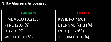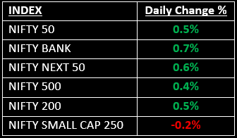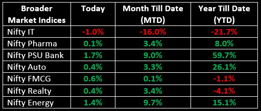 Broader indices were mixed, with the Nifty Midcap index up by 0.5%, while the Smallcap index ended slightly in the red. Sectorally, all sectors, except IT and Media, closed in the green.