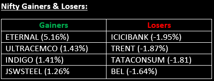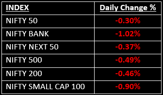 The broader indices once again underperformed the benchmarks, with the BSE Midcap and Smallcap indices both declining by approximately 1%. All sectoral indices, except for metal and oil & gas, ended the day in the red.