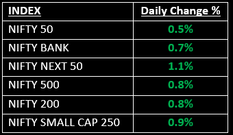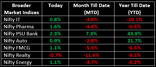 The broader market outperformed the benchmarks, with the BSE Midcap and Smallcap indices gaining over 1% each. Sectorally, while realty and consumer durables lagged, all other indices ended in positive territory.