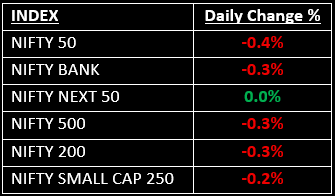 On December 26, Indian benchmark indices closed lower for the third consecutive day, as profit-booking dominated in the holiday-shortened week, compounded by continued selling from FIIs, which weighed on market sentiment.