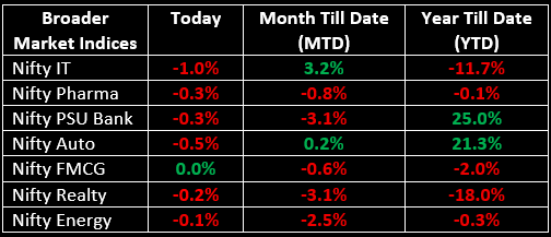 Among broader market segments, the BSE Midcap index fell by 0.2% and the BSE Smallcap index declined by 0.3%. On the sectoral front, the Metals and Consumer Durables indices rose by 0.6% and 0.4%, respectively, while the IT, Auto, Financial Services and Media sectors saw declines ranging from 0.5% to 1%.