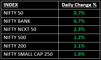 The broader indices outperformed the benchmarks, with the Nifty Midcap index gaining 1.66% and the Smallcap index rising 2.26%.