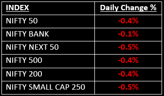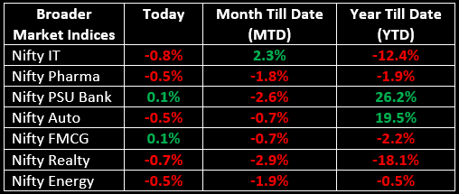 In the broader market, the BSE Midcap index dropped by 0.5%, while the BSE Smallcap index fell by 0.6%. On the sectoral front, only Media, FMCG and PSU Bank sectors ended in the green, with all other sectors closing lower.