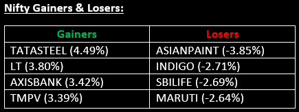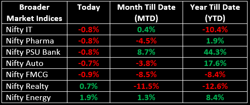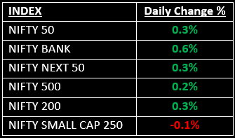 After a flat start, the market traded in the negative zone during the first half, but a surge in buying activity during the latter half helped recover losses, bringing indices close to the day's highs. Among broader indices, the Nifty Midcap and Smallcap indices ended ~0.2% higher