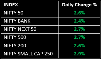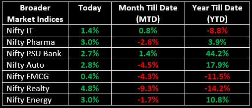 The broader market mirrored this strength, with both the Nifty Midcap and Smallcap indices climbing 2.8%. Sectorally, the rally was widespread, with Pharma, Financials, Realty, Energy and Consumer Durables emerging as top performers, each advancing 3–4%.