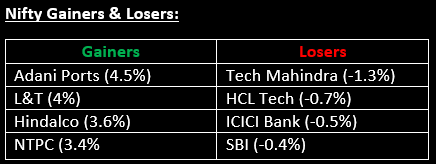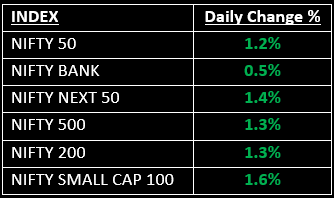 Broader markets outperformed the benchmarks, with the Nifty Midcap and Smallcap indices gaining over 1.5% each. On the sectoral front, all indices ended in positive territory, with IT being the only sector to close in the red (down 0.6%).