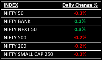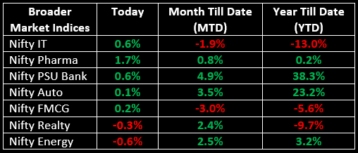 Among the broader indices, the BSE Midcap index slipped 0.2%, while the BSE Smallcap index fell 0.4%. On the sectoral front, IT, Pharma and PSU Banks rose by 0.5-1.7%, while Infra, Media and Oil & Gas sectors saw a decline of over 1%.