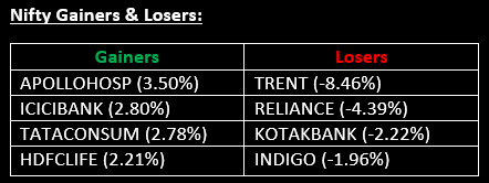 NIFTY: The index opened 60.60 points lower at 26,189.70, reached a high of 26,273.95 and closed at 26,178.70. Nifty formed a small red candle with upper and lower shadows on the daily chart, resembling a Doji-like candlestick pattern. Its immediate resistance level is now placed at 26,250 while immediate support is at 26,100.