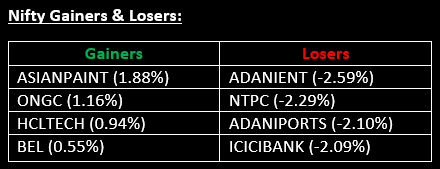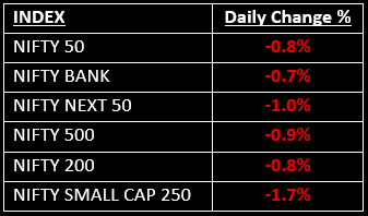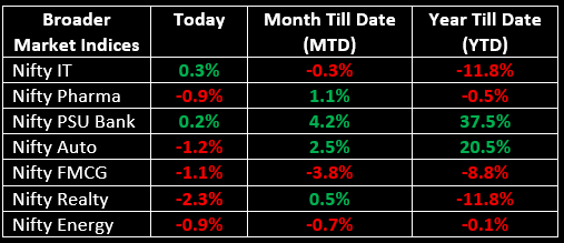 Broader indices continued to underperform, with the BSE Midcap index falling 0.9% and the BSE Smallcap index losing 1.7%. Among sectors, only IT, PSU Bank and Oil & Gas closed higher, while Auto, FMCG, Realty and Consumer Durables ended down by 1-2%.