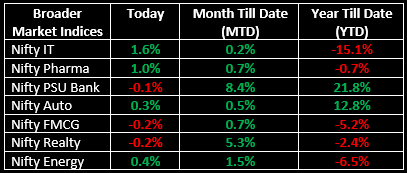 In the broader market, the BSE Midcap index gained 0.6%, while the Smallcap index declined by 0.3%. Sector performance was mixed, with IT, pharma, metal and defence sectors gaining between 0.5% and 1.6%, while realty, consumption and media sectors saw losses between 0.25% and 1%.