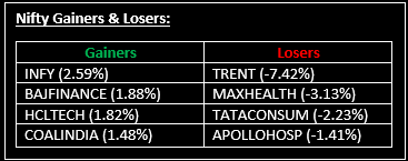 Indian markets kicked off the week on a positive note, with key indices breaking a three-day losing streak. Nifty closed above 25,550, supported by gains in IT, metal and pharma stocks. Top Gainer: INFY |Top Loser: TRENT