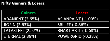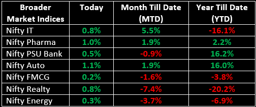 The broader indices followed the trend of the main benchmarks, with the BSE Midcap index advancing by 0.8% and the BSE Smallcap index rising by 0.5%. Sector-wise, all sectors ended in the green, except for Media and Oil & Gas.