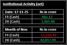 The Indian equity markets kicked off the week on a strong footing, marking their sixth straight session of gains on November 17, with the Nifty closing above the 26,000 level. Top Gainer: ETERNAL |Top Loser: TMPV