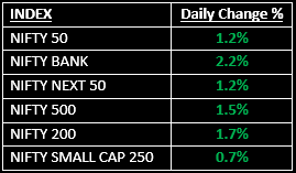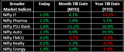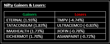 Broader markets outperformed, with the Nifty Midcap index hitting a fresh record high of 61,211.05 and the Nifty Smallcap index rising 0.5%. All sectoral indices ended in the green, led by Auto, PSU Banks, Private Banks, Financial Services, Energy and Consumer Durables, which gained 0.5–1%.