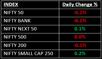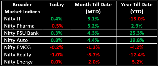 Among the broader indices, the BSE Midcap index fell 0.2%, while the Smallcap index saw marginal gains. Sector-wise, Auto, IT, PSU Banks and Metals rose between 0.3% and 0.8%, while the Realty index declined by 1% and the Consumer Durables and Pharma indices each dropped by 0.5%.