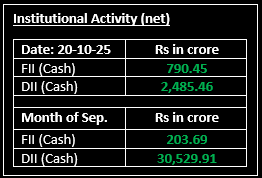 The Indian equity market wrapped up the final session of Samvat 2081 on a positive note, marking its fourth consecutive day of gains. Nifty started the session strong, crossing the 25,800 mark and extended its upward momentum, surpassing 25,900 intraday. The rally was fuelled by strong buying interest in heavyweight stocks like Reliance Industries and leading banking names, driven by impressive Q2 earnings reports.