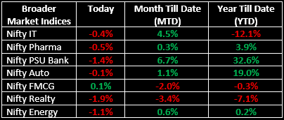 Broader indices underperformed the main benchmarks, with the BSE Midcap and Smallcap indices both falling 1.3%. With the exception of FMCG, all sectoral indices ended in the red.