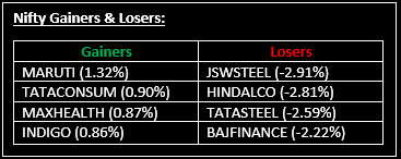 The Indian markets ended lower on November 21, snapping a two-day winning streak in a volatile session. The Nifty fell below the 26,100 mark amid broad-based selling across sectors. Top Gainer: MARUTI |Top Loser: JSWSTEEL