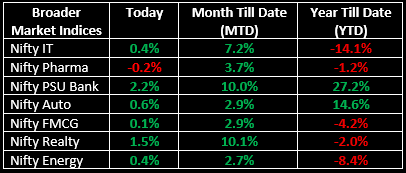 In the broader markets, the BSE Midcap index rose 0.7%, while the Smallcap index advanced 0.5%. Among sectors, barring defence, media and pharma, all sectoral indices ended higher, with metal, PSU bank, oil & gas and realty gaining between 1–2%.
