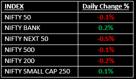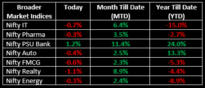 Among the broader indices, the BSE Midcap index inched up 0.12%, while the BSE Smallcap index ended marginally higher. Sectorally, Metal and PSU Bank indices gained 1.2% each, whereas IT, FMCG and Realty declined between 0.5%–1%.