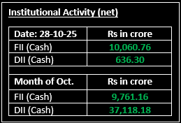 Indian benchmark indices remained under pressure on October 28, weighed down by broad-based selling across sectors except metals and banking. The markets opened slightly lower amid mixed global cues. Despite a brief recovery in early trade, indices slipped through most of the session. However, a late rebound helped pare some of the intraday losses.