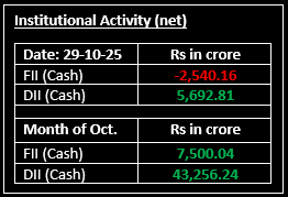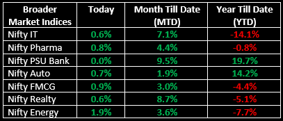 In the broader markets, the BSE Midcap and BSE Smallcap indices rose 0.7% and 0.6%, respectively. Sectorally, IT, Pharma, Financials, FMCG, Realty, Metals, Media and Oil & Gas advanced between 0.5% and 2%, while Auto (-0.7%) and Defence (-0.2%) slipped.