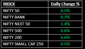 Benchmark indices ended higher on Wednesday, with the Nifty 50 closing above 26,050, supported by broad-based buying across sectors except automobiles and defence. After a mildly positive start, markets gained strength through the session ahead of the U.S. Federal Reserve’s policy outcome and renewed optimism over a potential India–U.S. trade deal.