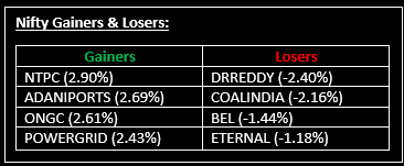 Benchmark indices ended higher on Wednesday, with the Nifty 50 closing above 26,050, supported by broad-based buying across sectors except automobiles and defence. After a mildly positive start, markets gained strength through the session ahead of the U.S. Top Gainer: NTPC |Top Loser: DRREDDY