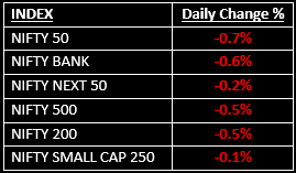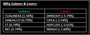 Indian equities ended lower on Thursday as cautious sentiment gripped investors following hawkish remarks from U.S. Federal Reserve Chair Jerome Powell. Top Gainer: COALINDIA |Top Loser: DRREDDY
