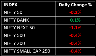 The Indian benchmark indices closed with minor losses, extending the losing streak for the fourth consecutive session on December 3. Among the broader indices, the BSE Midcap index declined by 1% and the BSE Smallcap index slipped 0.4%.