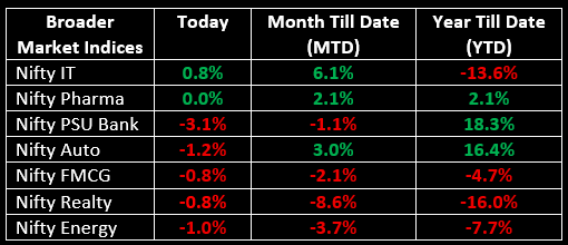 Among the broader indices, the BSE Midcap index declined by 1% and the BSE Smallcap index slipped 0.4%. Sector-wise, IT, Media and Private Banks gained between 0.25% and 0.8%, while PSU Banks fell by 3%, and Oil & Gas, Metals and Consumer Durables declined by 0.5% to 1.6%.