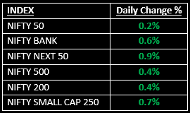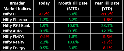 The broader market outperformed the benchmark indices, with the BSE Midcap index rising 0.6% and the Smallcap index gaining 0.7% by the close. Sector-wise, apart from Consumer Durables, IT and FMCG, all other sectors closed in the green, with Pharma, Realty and PSU Bank indices rising 1-2%.