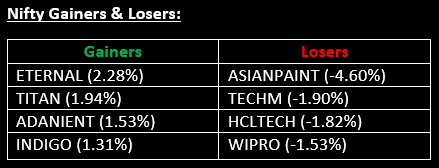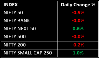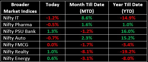 The broader indices outperformed, with the BSE Midcap index rising by 0.6% and the BSE Smallcap index climbing 1.3%. Sector-wise, IT, Auto, and Pharma sectors ended down by 0.5-1%, while Media, Realty, PSU Banks and Consumer Durables sectors saw gains ranging from 0.7% to 1.3%.