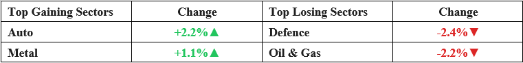 - Top Sector: Auto (+2.2%) led the recovery; Defence (-2.4%) lagged