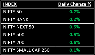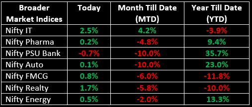Broader markets underperformed the benchmarks; the Nifty Midcap index rose 0.2%, while the Smallcap index ended with minor losses.