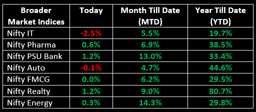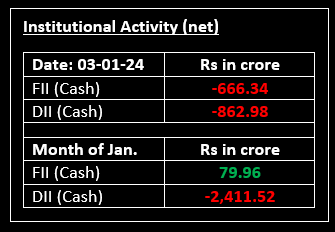 On January 3, benchmark indices experienced a second consecutive day of selling pressure, leading to losses in benchmark indices. This decline signalled caution in the market ahead of the upcoming third-quarter earnings season. Despite this, broader market indices performed relatively well, with Nifty Small cap 100 ending flat and Nifty Midcap gaining 0.3%. The Nifty 500, the broadest index on NSE, saw a 0.26% decrease. Notably, Nifty Realty emerged as the top gainer among sectoral indices, rising by 1.2%. Other notable gainers included Nifty PSU Bank and Nifty Pharma, while Nifty IT and Nifty Metal experienced significant declines.