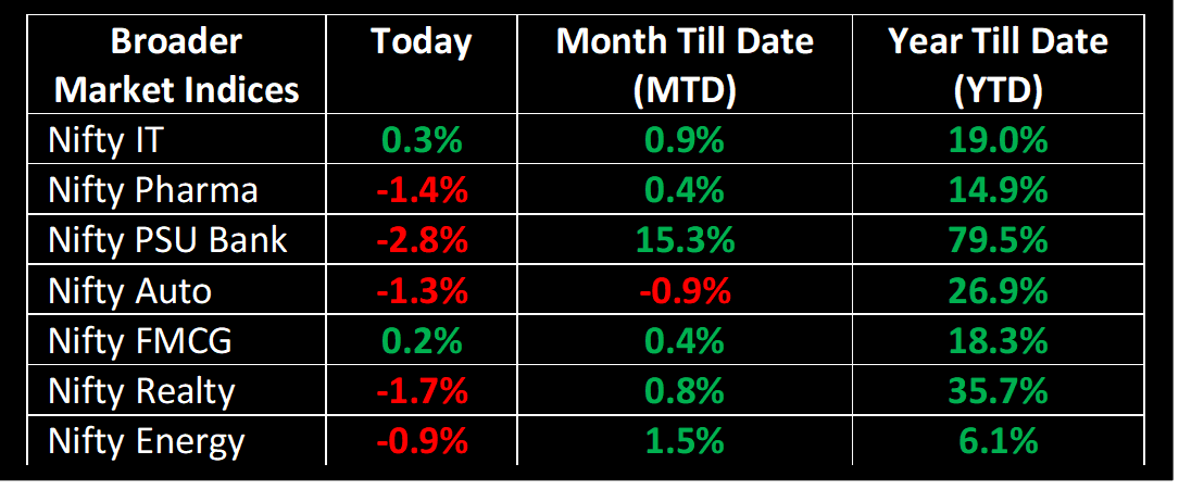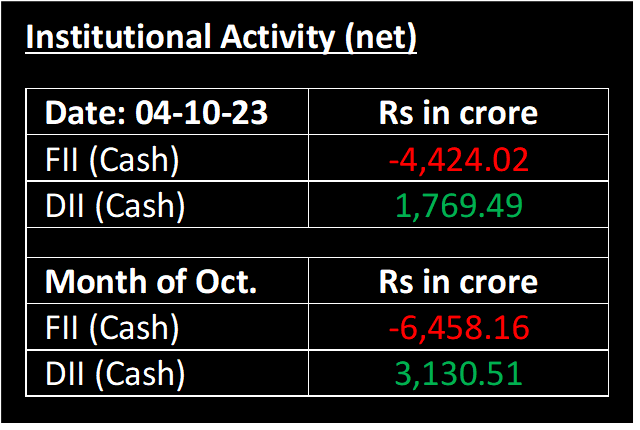 On October 4, the Nifty experienced its second consecutive day of declines, influenced by unfavourable global indicators and ongoing foreign institutional investor (FII) divestment. This downward trend was exacerbated by a strengthening US dollar and increasing US treasury yields, which contributed to a general aversion to risk in the market. International investors have been withdrawing their investments from Indian equity markets because the current surge in the US dollar and bond yields is diminishing the appeal of emerging market assets. Despite India's robust macroeconomic growth performance, the country is not immune to global challenges. Therefore, any correction in global markets driven by concerns about potential interest rate hikes is likely to have a ripple effect here.